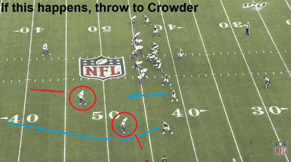 It’s possible the outside corner could shift inside while the safety rotates outside to cover Ryan Griffin’s vertical route over the top. If that happens, neither player would be open and the play would likely be dead. If both defenders stayed put, Crowder would be open for an easy first down.