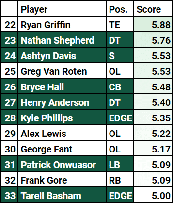 Chris Herndon (#10, 7.17) and Quinnen Williams (#12, 7.11) have the potential to soar into the top-5, and I think one or both just might do it, but their No. 10 and No. 12 rankings are a fair middle ground that projects progression while not approaching too closely to their ceilings.