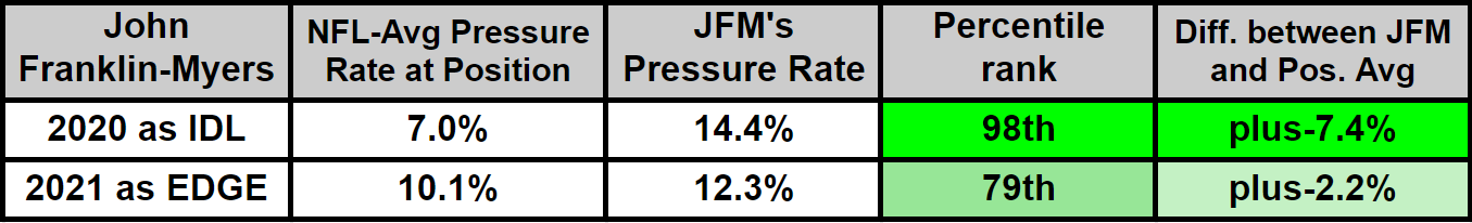 On the edge, Franklin-Myers produced pressure at a lower frequency than he did on the inside despite the fact that edge rushers are expected to produce pressure at a much higher frequency than interior rushers.
