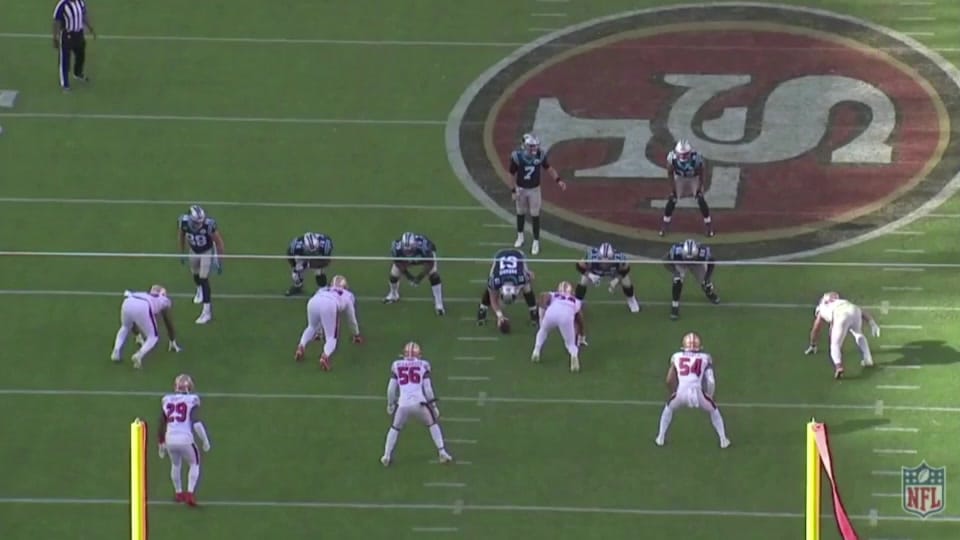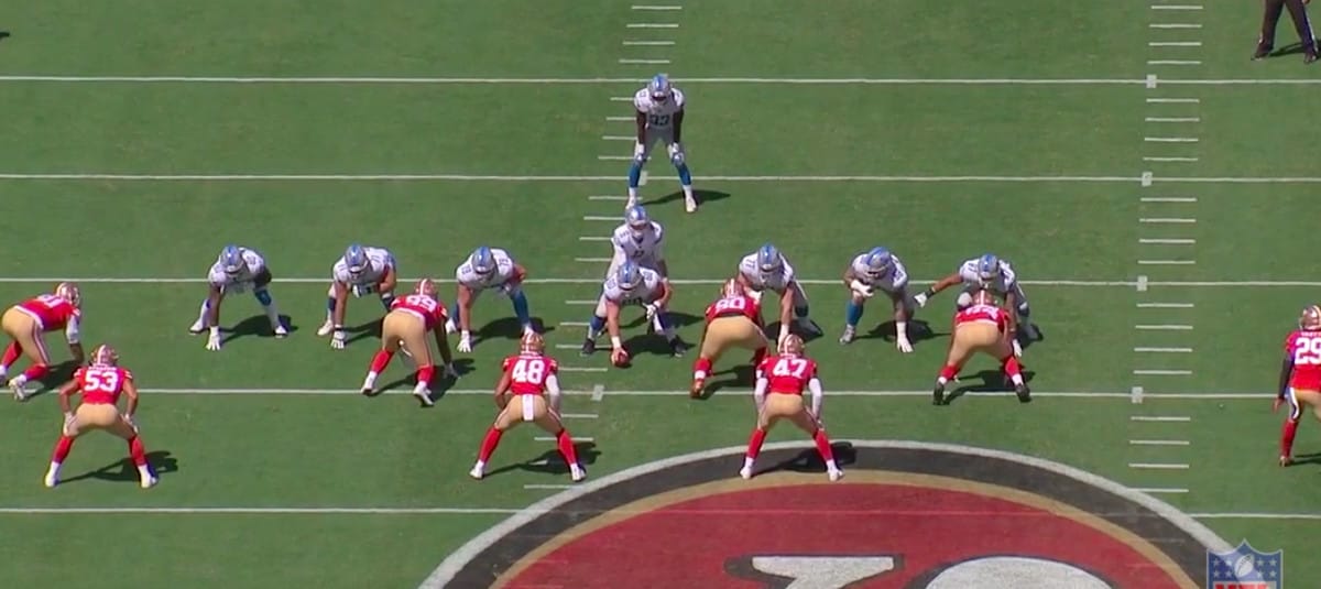 In the first image below, on your left, you’ll see the 49ers’ Arik Armstead in a wide-9 alignment outside of the tight end. In the second image, on your right side, you’ll see Nick Bosa in a wide-9 alignment with no tight end on his side.