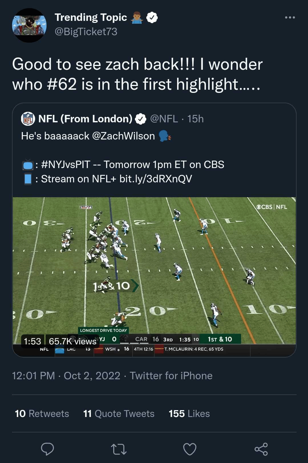Before the game, the NFL’s Twitter handle marked Zach Wilson’s return with a tweet of some of his highlights.