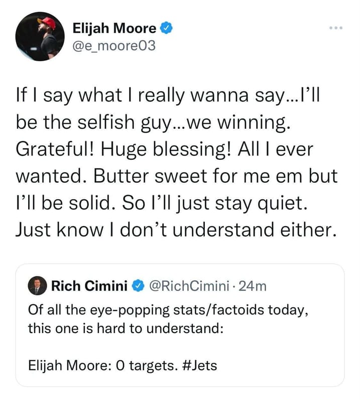 โThe #Jets have no plans to trade Elijah Mooreโ would be the message from this front office, whether or not theyโd actually pull the trigger. Leverage, culture message, etc.