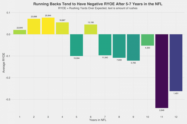 The PFF article I linked above states that once a running back reaches 1,500 carries, it is a strong sign that a drop-off is coming. It says, “In the PFF era, there have been 27 seasons where a running back had at least 1,500 carries going into the season โ only seven of those seasons resulted in positive RYOE.”