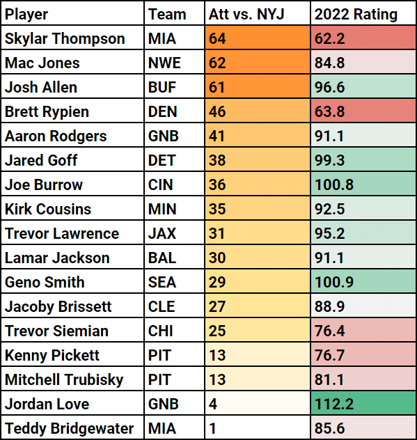 The Jets faced 20 quarterbacks last season. Combined, their average passer rating in 2022 was 86.2 after weighing each player based on how many pass attempts they threw against the Jets.
