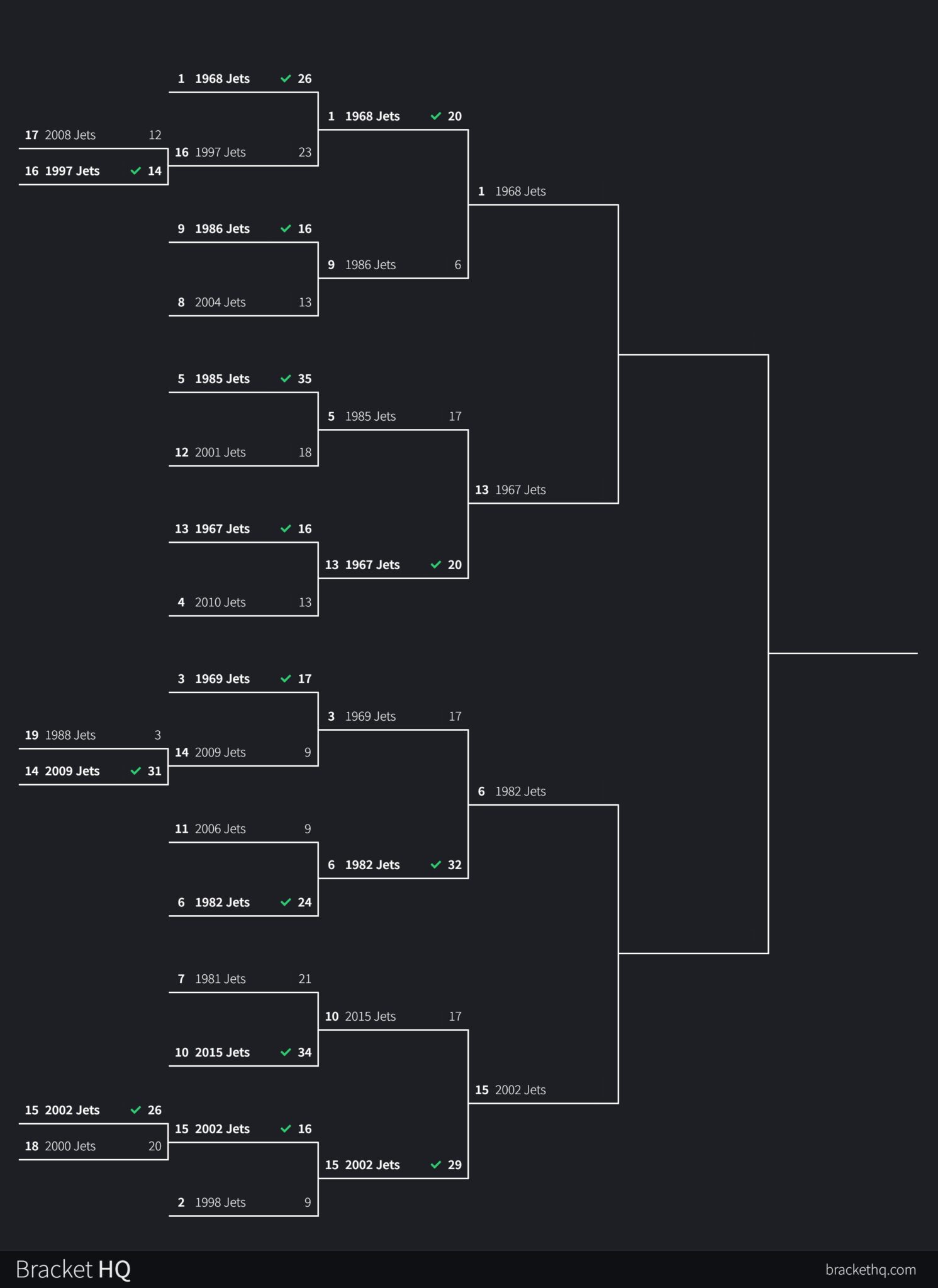 Using the matchup simulator at What If Sports, I simulated a tournament bracket featuring every .500+ team in New York Jets franchise history.