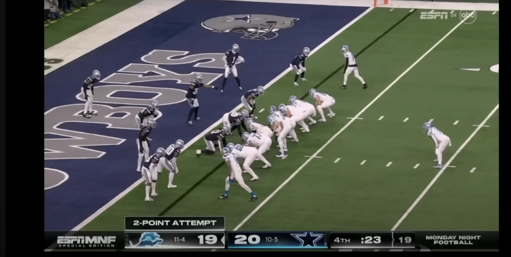 In December 2023, the Lions and Cowboys faced off in a game that had implications for NFC playoff seeding. The Cowboys held a 20-13 lead, but the Lions scored a touchdown with 23 seconds remaining to cut the lead to one. They decided to go for two to try to take the lead. They came out in a strange formation.
