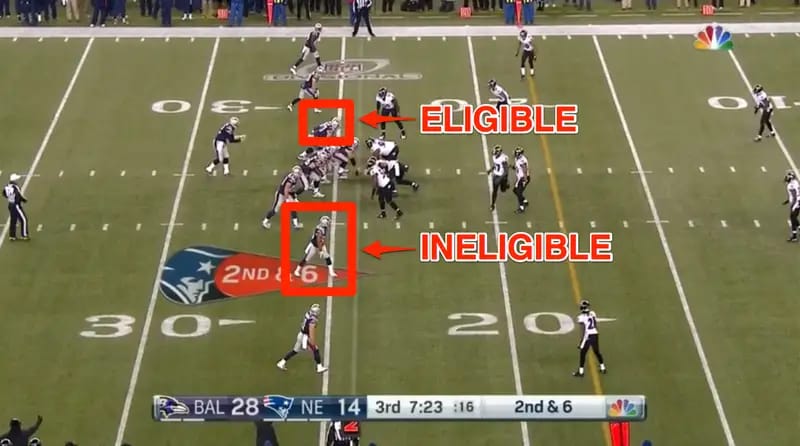 This confused the Ravens, as they thought the player at the tackle spot was ineligible (as usual) and the receiver was eligible (as usual). The Patriots then threw to the eligible receiver (No. 47) who had lined up in the offensive tackle spot and was wide open.