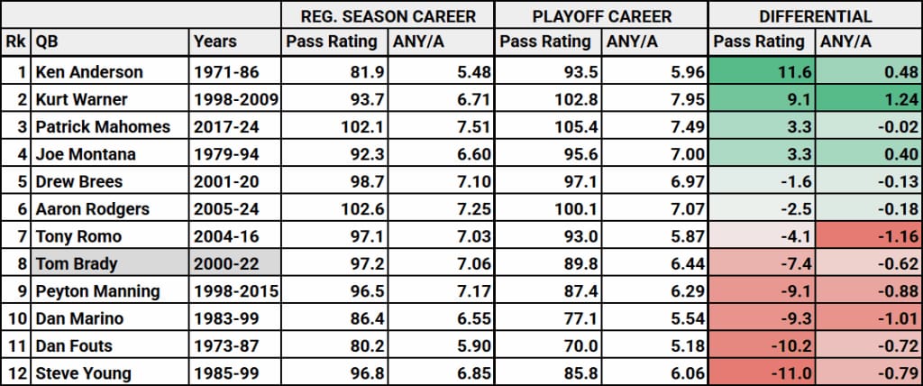 Let’s take the top 12 quarterbacks from the combined era-adjusted leaderboard that we analyzed just a few paragraphs ago. These are Brady’s closest competitors in the all-time debate (there is a big drop-off after the No. 12 spot on that list). How does he compare to them in terms of rising to the occasion in the playoffs? Surely, the seven-time champ will separate himself in this category.