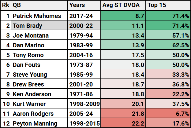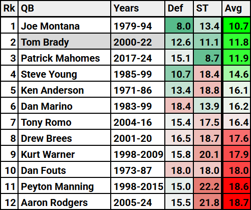 Interestingly, many of the all-time great quarterbacks received poor special teams support in their careers. Brady, though, was consistently buoyed by his special teams. The same goes for Mahomes.