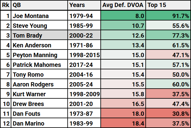 Joe Montana and Steve Young benefited immensely from the dominant 49ers defenses of the ’80s and ’90s. After that, though, it’s Brady who sits apart from the pack as the best-supported quarterback in terms of defense. His teams had an average defensive DVOA ranking of 12.6 (third of 12), finishing with a top-15 ranking 77.3% of the time (second of 12).