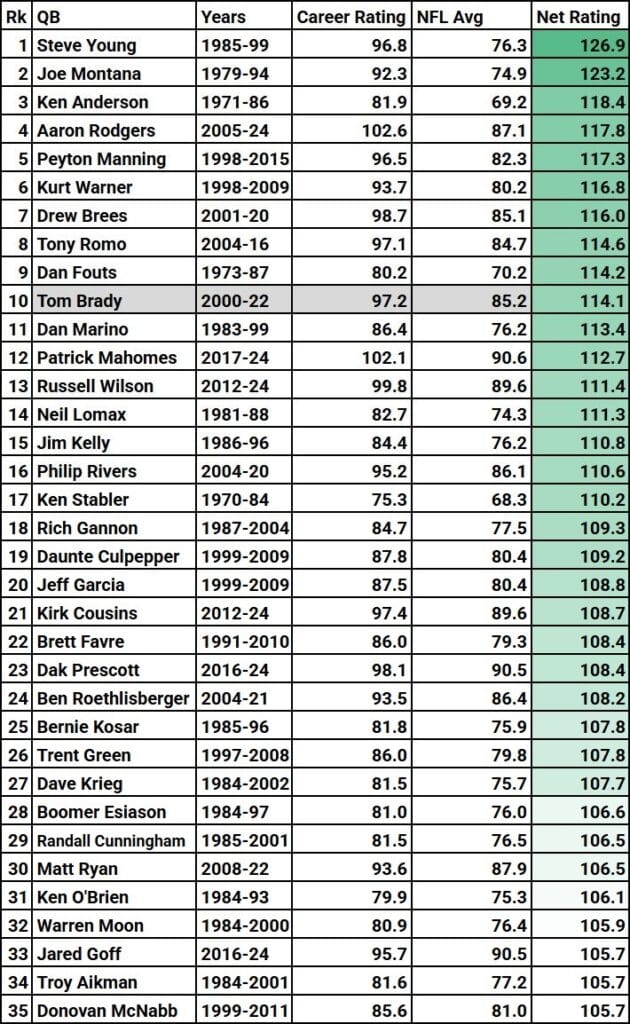 Among quarterbacks who debuted after the 1970 merger, here are the all-time leaders in net passer rating among quarterbacks with at least 3,000 career pass attempts.