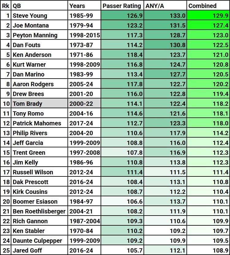 Now, let’s bring these two metrics together. Here are the top 25 quarterbacks based on the combined average of their era-adjusted passer rating and era-adjusted ANY/A.