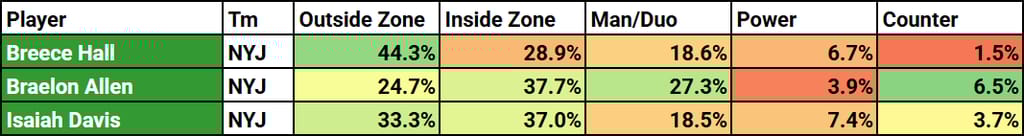 Hall’s distribution is the best indicator of the Jets’ priorities, since he was the clear-cut RB1 and responsible for 63% of the team’s running back carries. It is worth noting, though, that the Jets were much less outside zone-heavy with their other two running backs, Braelon Allen (92 carries) and Isaiah Davis (30).