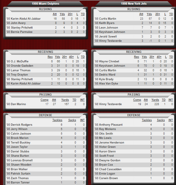 After a scoreless third quarter, Miami began the fourth quarter with back-to-back touchdowns by O.J. McDuffie and Karim Abdul Al-Jabbar to steal the 21-20 lead. But with six minutes left, Testaverde led the Jets on a five-minute march down the field for a go-ahead John Hall field goal.