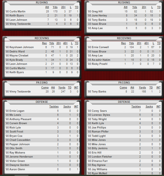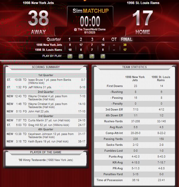 St. Louis jumped out to a 10-0 first quarter lead, but Testaverde responded with two 4-yard touchdown passes to Jets X-Factor’s Wayne Chrebet in the second quarter, giving New York a 17-10 halftime edge. The offense kept the foot on the gas pedal and sprinted to a 38-17 win.