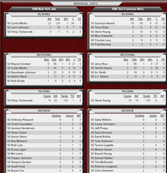 The Jets’ secondary, featuring future head coach Aaron Glenn, held Jerry Rice to four receptions for 66 yards. Young passed for 125 yards, no touchdowns, and an interception by Victor Green.