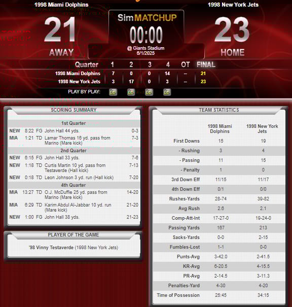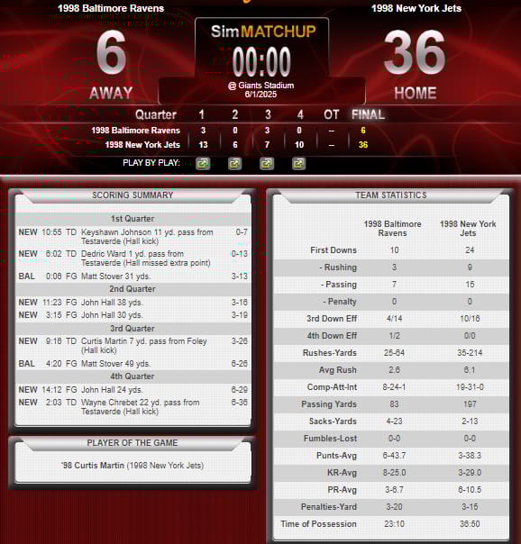And this time, the quarterback change was the difference. In real life, Foley tossed one touchdown and three interceptions against a defense that finished 24th against the pass. But in this simulation, Testaverde went 17-of-29 for 203 yards, three touchdowns, and zero interceptions to spark a 36-6 blowout win for the home squad.