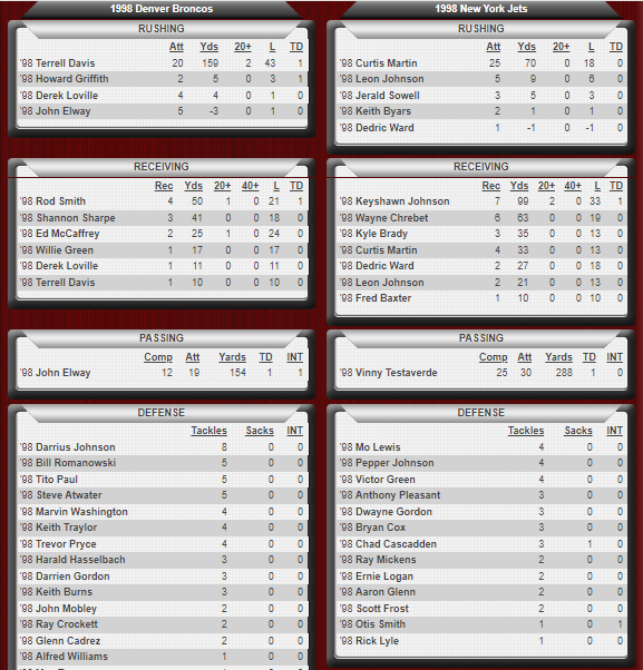 It is also worth noting that Bill Parcells’ disciplined team finished the game with just one penalty for five yards. This is accurate to real life, as the 1998 Jets finished with the third-fewest penalties in the NFL.