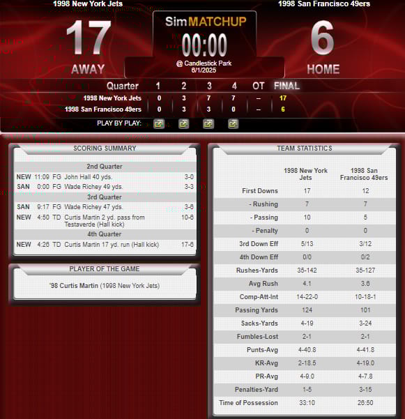 What If Sports allows us to simulate a game between any two NFL teams from any season in history. So, we can replay the exact matchups on the Jets’ 1998 schedule that cost them home-field in the AFC championship game.
