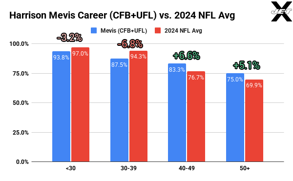 Here is a look at Mevis’ career field goal percentages (between Missouri and Birmingham) broken down by range, and how they compare to the average NFL kicker in 2024.