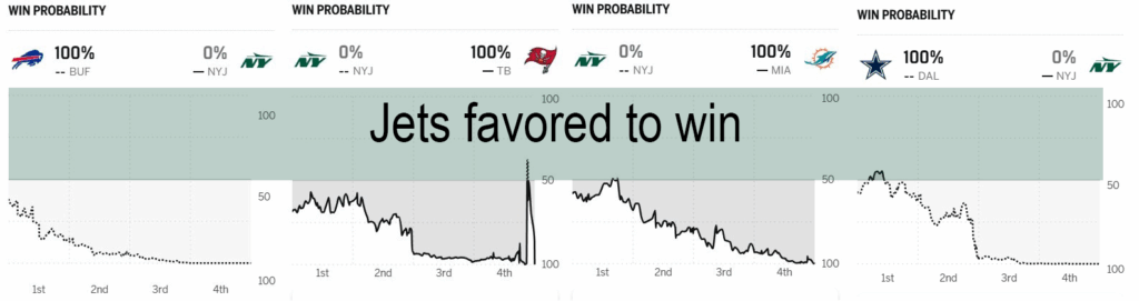 To best encapsulate the Jets’ ineptitude over the past four games, we should look at their win probability flow charts.