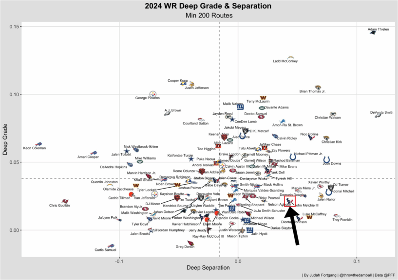 The problem for Metchie is that his separation did not amount to much. He was well below average when it came to his performance at the catchpoint on deep routes.