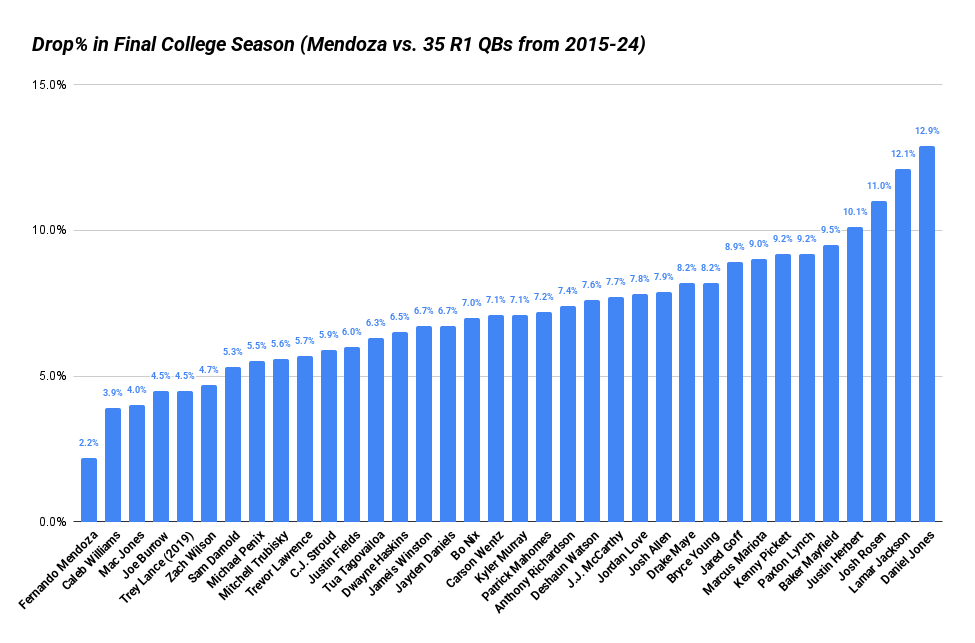 That is far lower than the rate of any first-round quarterback drafted from 2015-24 in their final college season; the lowest mark among that 35-man group is 3.9% (Caleb Williams’ 2023 season at USC). The average among those 35 quarterbacks was 7.2%, a rate that is more than triple Mendoza’s.